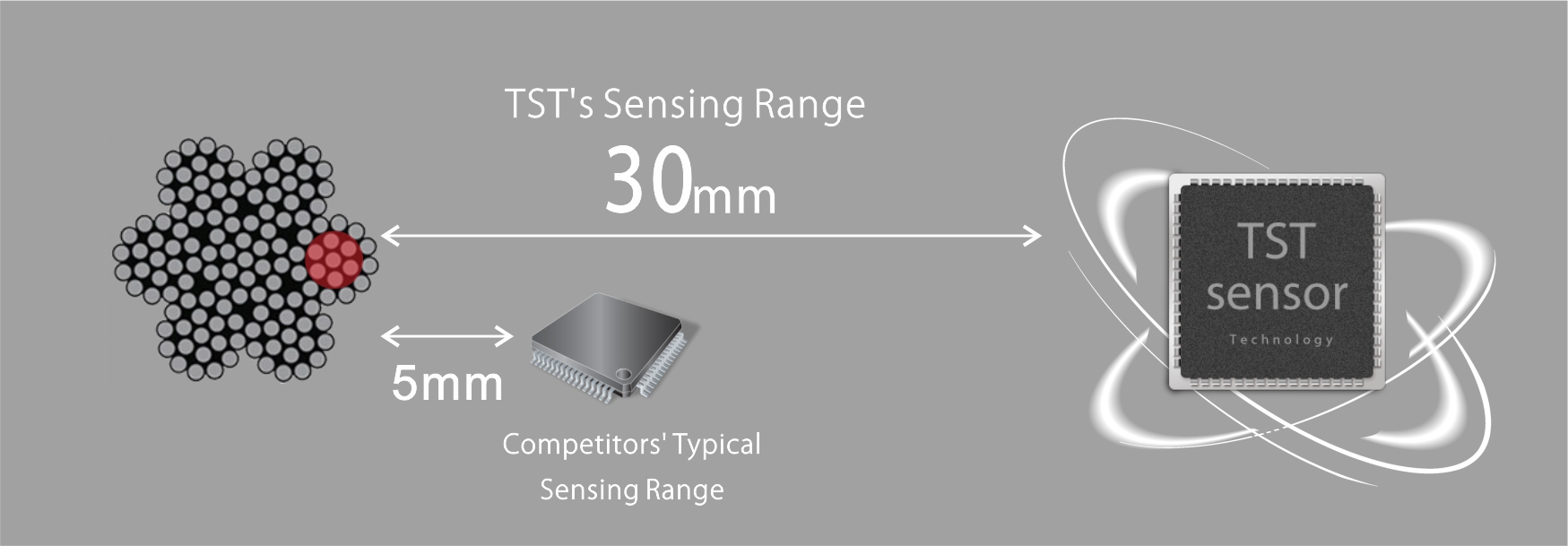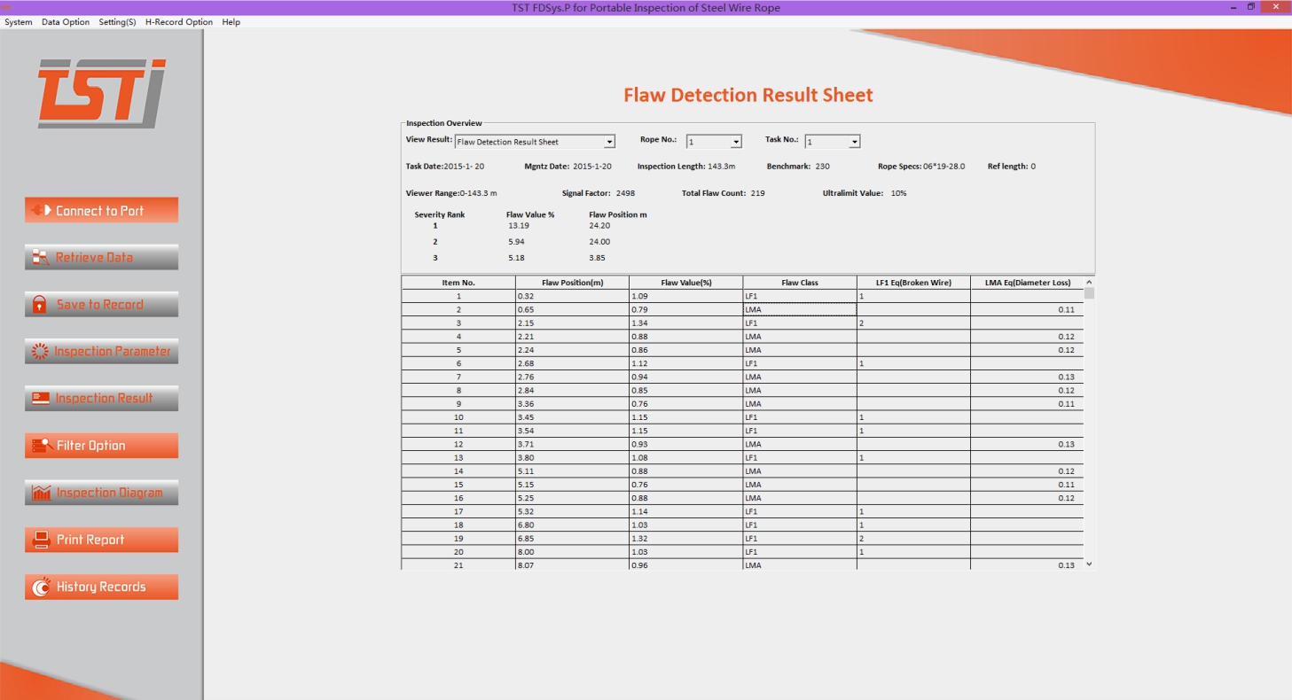 Wire rope defects include two main types: the loss of metallic area(LMA), local faults(LF). The focus of the test is to detect the EM field signal induced by the target and recognize the featured flaw signals through regulating and detecting process. The advantage of such a high sensitivity and high resolution is that all different types of flaws on the target will be detected from internally and externally. TST advanced sensor technique ensures that the noise signals are effectively screened out so that we could develop an accurate pattern recognition model for system automation and intelligent computer evaluation