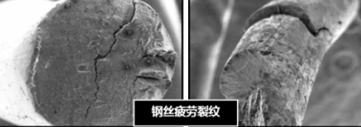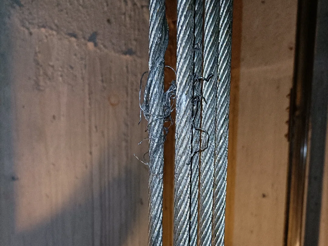 The internal damage of the wire rope is obscured by grease and dirt