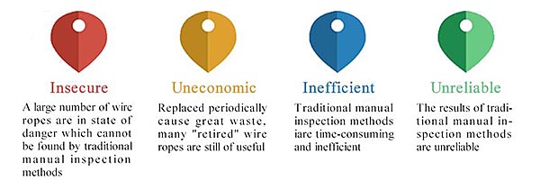 Manual inspection method is widely existed in the world, however, a variety of problems caused by manual inspection lead to the safety condition of wire rope is not optimistic at present, mainly reflected in following aspects: