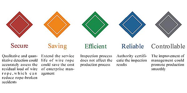 TST Flaw Detection System (TST FDSysTM) is created by TST scientists and engineers to automatically inspect the physical flaws on the wire ropes. Given the inspected flaw data, the system can thus make evaluations of the wire rope safety status and operating performance of the targets. For the onsite engineers and operating managers, TST-FDSysTM will provide both realtime wire rope inspection monitor alongside the producing operation and comprehensive report at end of per inspection task. Therefore, flaws on the inspecting target will be noticed instantly wherever it appears and the automatically generated report will demonstrate the overall status of the target with detailed analysis of each inspected flaw.
